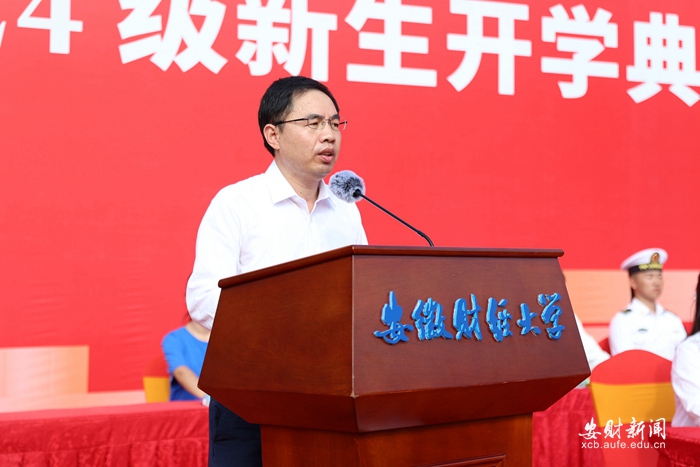 校友代表施建军教授以自己从安财启航、一路成长的经历,鼓励学弟学妹们要珍惜大学时光,不断充实自己、发展自己,把自己塑造成国家和社会需要的栋梁之才,展示安财学子的风采。他还跟学弟学妹们分享了四点经验:一是要科学规划人生发展和职业生涯的道路;二是要尽快完成中学到大学的转变;三是要在大学养成良好的生活和学习习惯;四是在提升智商的同时,努力完善情商。