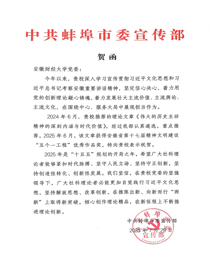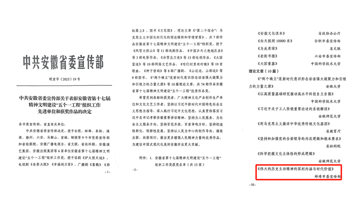 近日,中共安徽省委宣传部颁布《关于表彰安徽省第十七届精神文明建设“五个一工程”组织工作先进单位和获奖作品的决定》。我校在此次评选中实现重大突破,马克思主义学院张晓婧教授撰写的理论文章《伟大的历史主动精神的深刻内涵与时代价值》获得优秀作品奖,这也是学校首次获此殊荣。