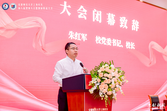 朱红军首先对会议的顺利召开表示祝贺,向上海校友会上一届理事会全体成员致以崇高敬意,同时特别感谢在上海校友会建设中贡献突出的几位校友。随后他回顾了近年来学校在获批博士学位授予单位、合肥高等研究院建设推进等方面取得的成绩。他表示校友是安财精神的“践行者”,是母校声誉的“金名片”,母校永远是校友们随时可以停靠的港湾。他希望上海校友们将安财人的财经专长、务实作风与上海的开放基因、创新活力同频共振,让安财人的奋斗担当在黄浦江畔绽放光彩;更期待大家充分发挥身处国际大都市的资源优势,成为母校与上海产业界、学术界深度联动的重要桥梁纽带。最后,他还叮嘱广大上海校友:多抽些时间陪伴家人,让亲情成为疲惫时的“充电站”;在繁忙工作之余保重身体,让健康成为长久奋斗的“压舱石”。